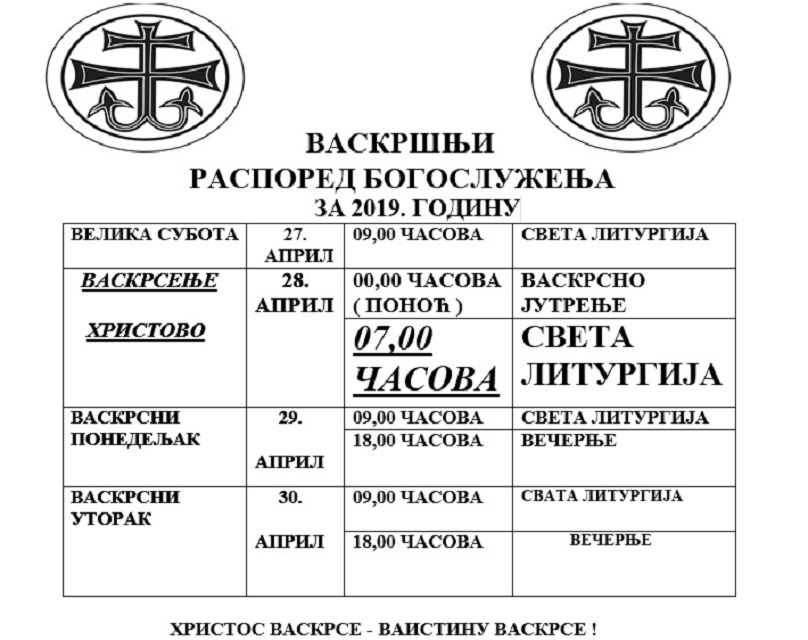 Недеља – Ускрс, 28 април: Васкрсно јутрење у 00 часова (поноћ), Света Литургија у 7 часова и вечерње служење у 18 часова.