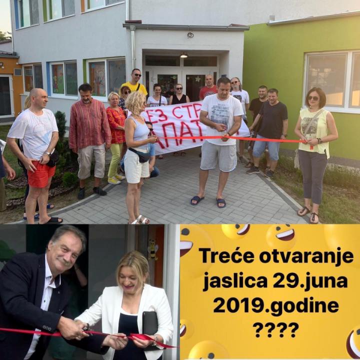 У вези са тим, дана 27. јуна, свечано смо пресекли врпцу. Зато, молимо Вас који ћете се сутра окупити у 14:30 на травњаку свеже покошеном, да шапнете Председнику да су јаслице до сада већ два пута свечано отворене.