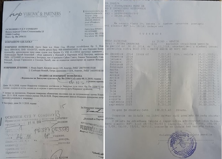 -Само сам, једном, видео да ми фали пола пензије! Отишао сам у социјално да видим о чему се ради, кад тамо – нови шок! Судско решење по потраживању Ерсте банке по коме се теретим за дуг од 330,26 евра! И, пензијско ми је ставило обуставу на око 8.000 динара месечно. Отишао сам у банку да питам шта је сада то и откуд се, после четири године појавио тај дуг, али одговор до данас нисам добио, наставља Слободан.