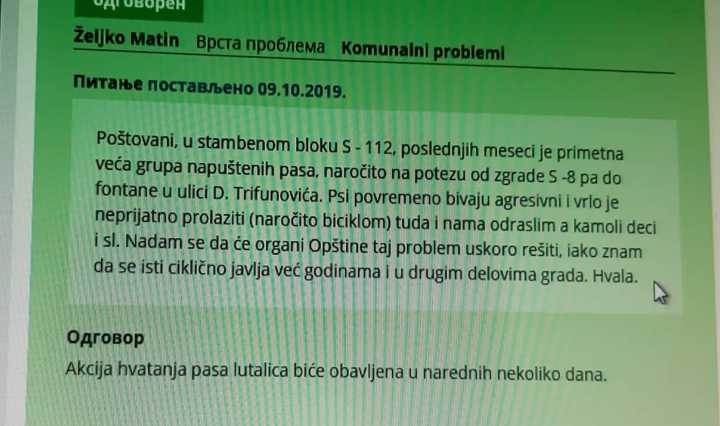 У одговору који је добио стајало је кратко „Акција хватања паса луталица биће обављена у наредних неколико дана“.