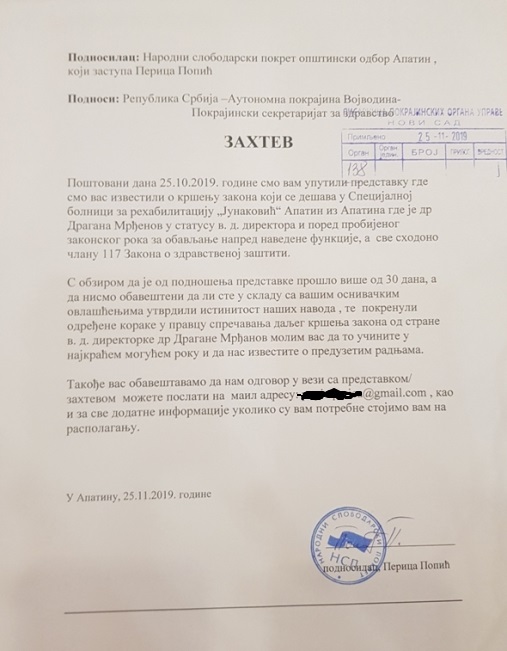 С обзиром да је од подношења представке прошло више од 30 дана, а да није било никаквог одговора, Народни слободарски покрет је данас поднео нови ЗАХТЕВ Покрајинском сркретаријату за здравство да у складу са својим оснивачким овлашћењима утврди истинитост њихових навода , те покрене одређене кораке у правцу спречавања даљег кршења закона од стране в. д. директорке др Драгане Мрђанов и сходно Закону о информацијама од јавног значаја обавести их о до сада предузетим мерама.