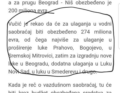 -За улагања у водни саобраћај биће обезбеђено 274 милиона евра, од чега највише за улагање у проширење луке Прахово, Богојево, у Сремској Митровици, затим за изградњу нове луке у Београду, додатна улагања у Луку Нови Сад, у луку у Смедереву и друго, рекао је јуче председник Вучић.