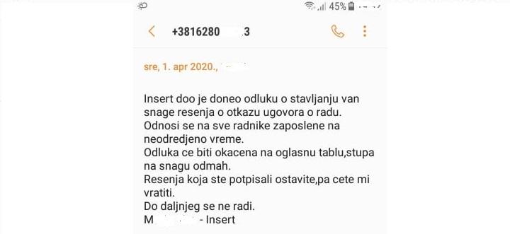 -Инсерт доо је донео одлуку о стављању ван снаге решења о отказу уговора о раду. Односи се на све раднике запослене на неодређено време. Одлука ће бити окачена на огласну таблу, ступа на снагу одмах. Решења која сте потписали оставите, па ћете ми вратити. До даљњег се не ради, стоји у смс поруци коју су данас добили запослени, а коју је потписала административна радница Инсерта доо.