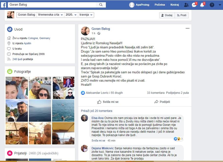 -Људи, ја нисам председник Насеља, нити желим бити. Ја сам само хтео да помогнем угроженима, без икакве користи за себе, пошто видим да нико ништа не предузима. И онда, кад неко хоће да помогне, ви му не дозвољавате. Е, због таквих (а нажалост их је већина) се повлачим, па живите по старом, навероватније боље. Списак за пакете (где сам се мучио правећи га, данима) сам предао Дубравки Кораћ и зато вас молим да ми више не пишете, нити ме зовете, написао је Горан на свом профилу.