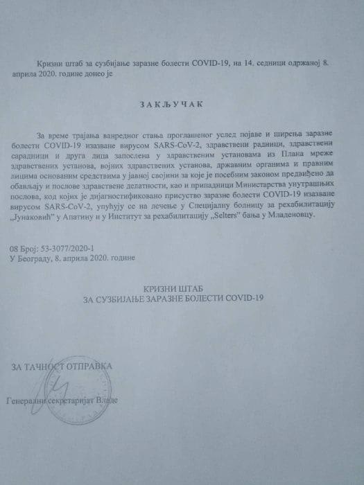 За време трајања ванредног стања проглашеног услед појаве и ширења заразне болети ЦОВИД-19 изазване вирусом САРС-ЦоВ-2, здравствени радници, здравствени срадници и друга лица запослена у здравственим установама из Плана мреже здравствених установа, војних здравствених установа, државним органима и правним лицима основаним средствима у јавној својини за које је посебним законом предвиђено да обављају и послове здравствене делатности, као и припадници Министарства унутрашњих послова, код којих је дијагностиковано присуство заразне болести ЦОВИД-19 изазване вирусом САРС-ЦоВ-2, упућују се на лечење у Специјалну болницу за рехабилитацију „Јунаковић“ у Апатину и у Институт за рехабилитацију „Селтерс“ бања у Младеновцу, стоји у документу Кризног штаба за сузбијање заразне болести ЦОВИД-19, овереног печатом Генералног секретаријата Владе.