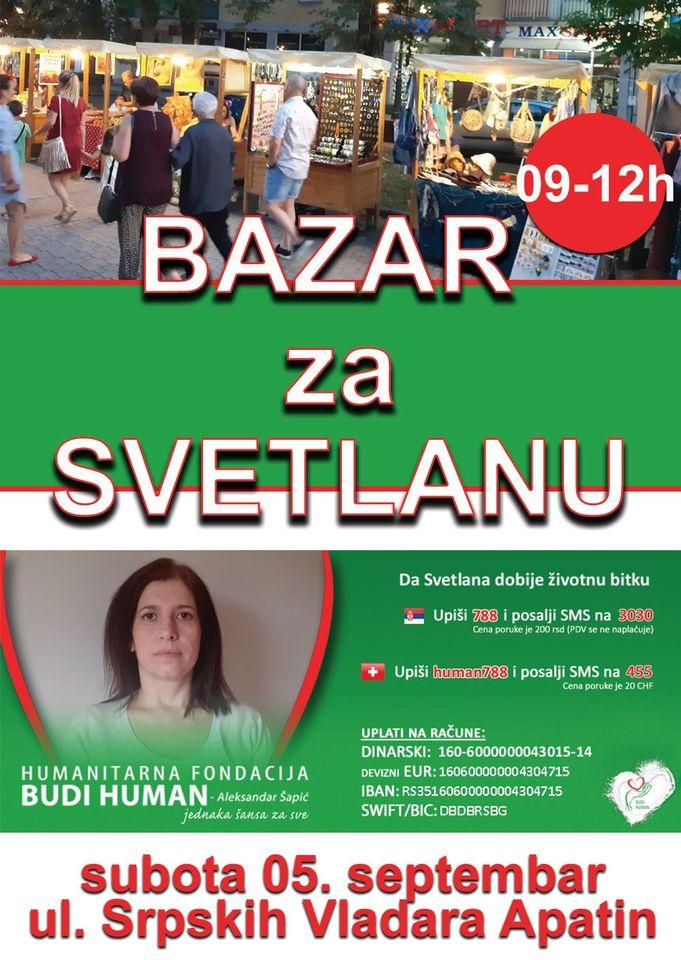 У суботу, 5. септембра од 9 до 12 часова у Апатину, на шеталишту улице Српских владара, одржаће се хуманитарни базар за Светлану.