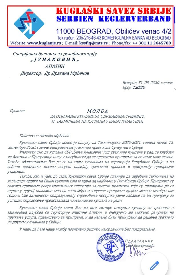 -Такође, као и увек до сада, Куглашки савез Србије планира да одређена такмичења из календара одржи на Вашој куглани, која је један од најбољих у РС. Приоритет су, свакако, припреме репрезентативних селекција за светска првенства која су планирана да се одрже у другој половини септембра изавршне припреме крајем октобра ове године. Ове активности подразумевају спровођење поступка јавне набавке па би препреку за успешно спровођење представљала чињеница да куглана не ради. КСС Вас моли да што хитније отворите куглану, наводи се у писменој молбикоју је, испред Куглашког савеза Србије, потписао председник Урош Драгојловић.