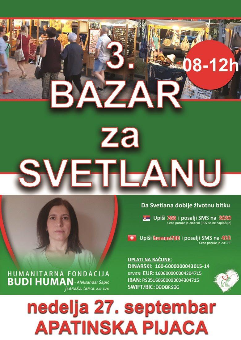 У суботу ће се у Сомбору одржати Хуманитарни базар са кога ће сва средства бити уплаћена за Светланино лечење. Базар ће се одржати испред ДМ-а, на главној улици, са почетком у 9 часова.