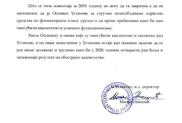 -Што се тиче извештаја за 2019. годину не могу да га завршим а да не напоменем да је Оснивач Установе за стручно оспособљавање одраслих средства по финансијском плану уредно и на време пребацивао како би нам омогућили квалитетно и успешно функционисање. Хвала Оснивачу и свима који су омогућили квалитетан и несметан рад Установе, а на нама запосленим у Установи остаје као основни задатак да се још више залажемо и трудимо како би у 2020. години остварили још бољи и запаженији резултат на обострано задовољство, закључено је у Извештају који је потписала Милка Никшић, в.д. директора Установе за стручно оспособљавање одраслих.