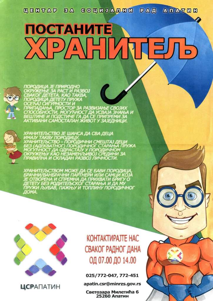 Предност боравка детета у хранитељској породици која је у месту где је дете живело пре издвајања је вишеструка због чега позивамо породице које су заинтересоване да буду хранитељи да се јаве у ЦСР Апатин у канцеларију бр.14 или на број телефона 025/772-047 до 19.04.2021. године како би добили потребне информације о самој процедури, условима и потребној документацији.