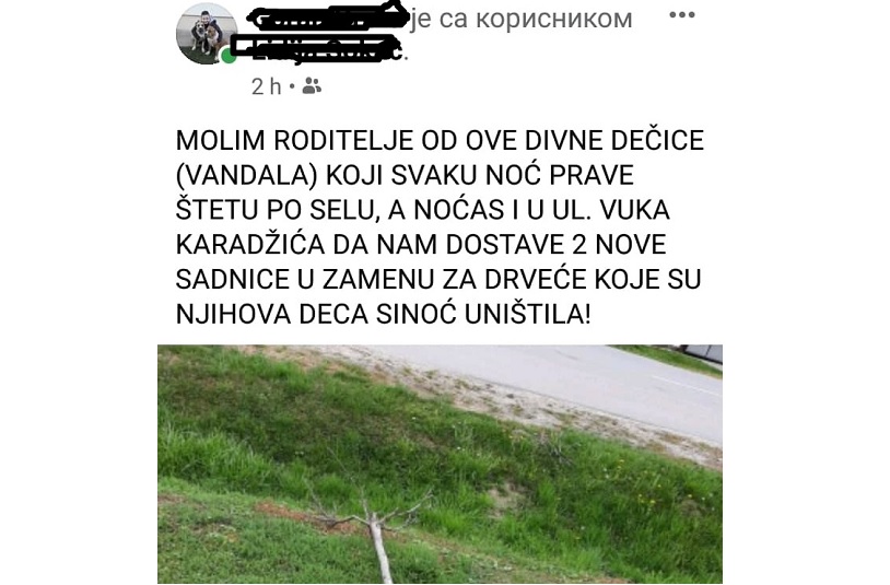 -Молим родитеље од ове дивне дечице (вандала) који сваку ноћ праве штету по селу, а ноћас у улици Вука Караџића, да нам доставе две нове саднице у замену за дрвеће које су њихова деца синоћ уништила, написао је овај Сонћанин.