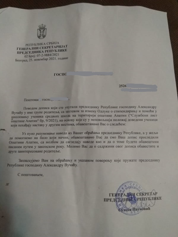 -Уз пуно разумевање навода из Вашег обраћања председнику Републике, а у жељи да помогнемо на било који начин, обавештавамо Вас да смо Ваш допис проследили општини Апатин, са молбом да сагледају наводе као и да о томе будете обавештени писаним путем у законском року, наведено је у одговору који је потписала Сузана Пауновић, генерални секретар председника Републике.