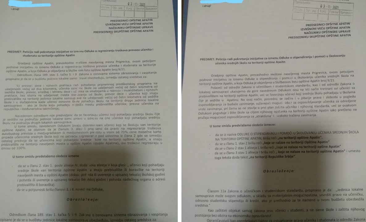 Почетком новембра председници општине, Општинском већу, начелнику Општинске управе и председнику СО Апатин, упућене су две петиције, које је потписало преко 200 грађана. У једној се захтева измена Одлуке о стипендирању и помоћи у школовању ученика средњих школа на територији општине Апатин, а у другој измена Одлуке о регресирању трошкова превоза ученика и студената са територије општине Апатин.