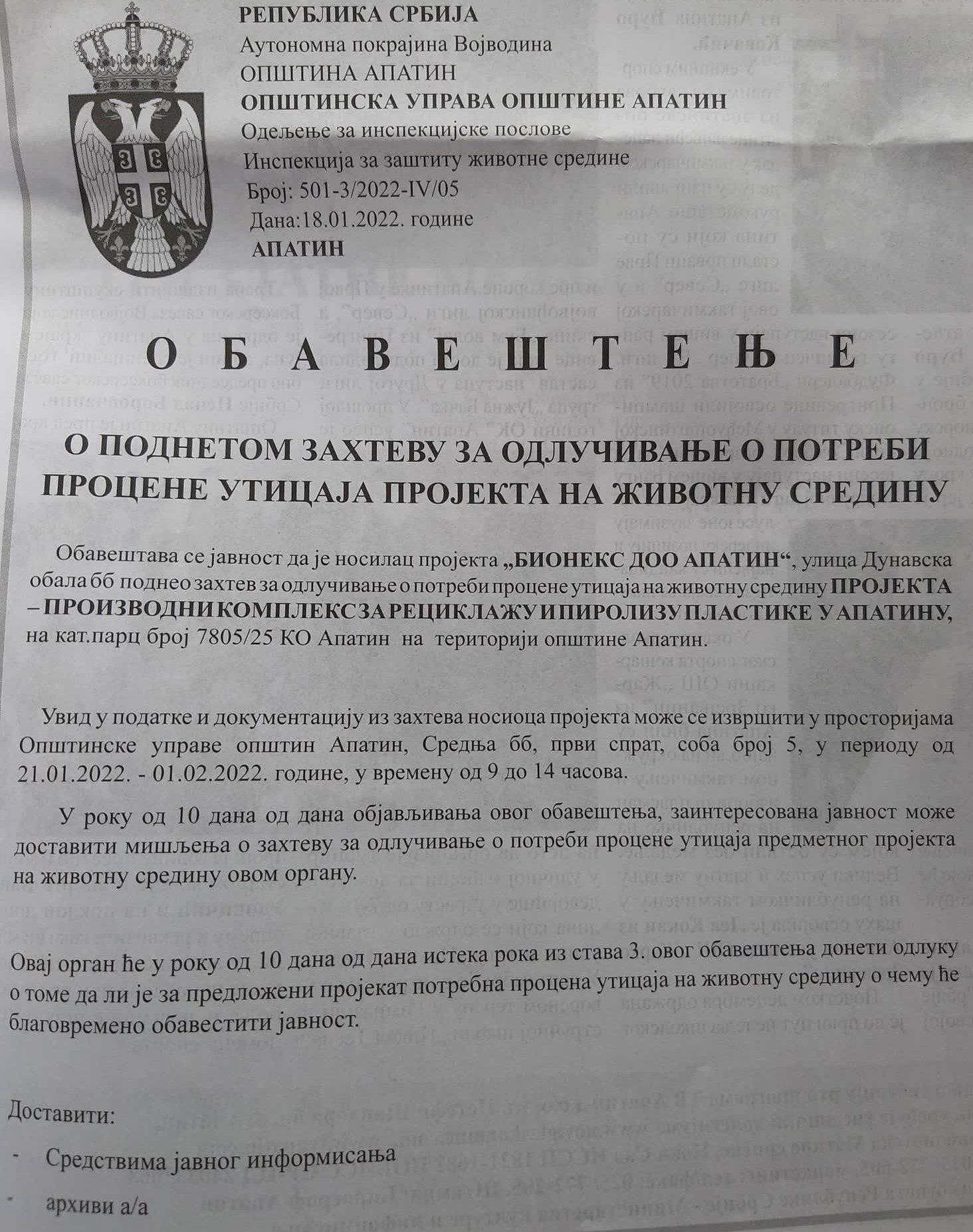 У обавештењу је још додато да се „увид у податке и документацију из захтева носиоца пројекта може извршити у просторијама ОУ општине Апатин, Средња бб, први спрат, соба број 5, у периоду од 21. јануара до 1. фебруара 2022. године, у времену од 9 до 14 часова“.