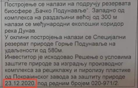 Није Вас било ни брига што сте "Бионеxу" земљиште продали 18. децембра 2020. године, ради изградње објеката индустрије и складишта, па се обавезујете да тај Уговор закључите у року од 30 дана, а да је при том "Бионеx" исходовао дана 23. децембра 2020. године, пет дана након Ваше одлуке о отуђењу, код Покрајинског завода за заштиту природе Решење о условима заштите природе за изградњу производног комплекса за рециклажу и пиролизу пластике под бројем 020-971/2.