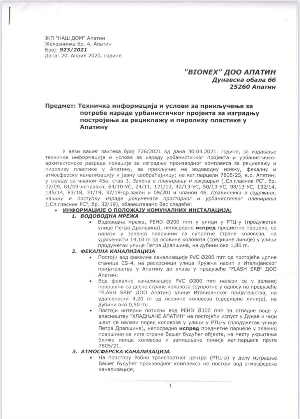 Поменути документ под бројем 923/2021 од 20.4.2021. године је уредно заведен у деловоднику ЈКП “Наш дом” (коме је оснивач општина Апатин) и потписан од стране директора Небојше Смиљанића. Овај документ, на недвосмислени начин, показује да је још када је поднесен захтев ЈКП, 30.03.2021. године, било познато оснивачу овог предузећа, општини Апатин (дакле, пре 10 месеци), да фирма “Бионекс” планира РЕЦИКЛАЖУ И ПИРОЛИЗУ ПЛАСТИКЕ у Апатину.