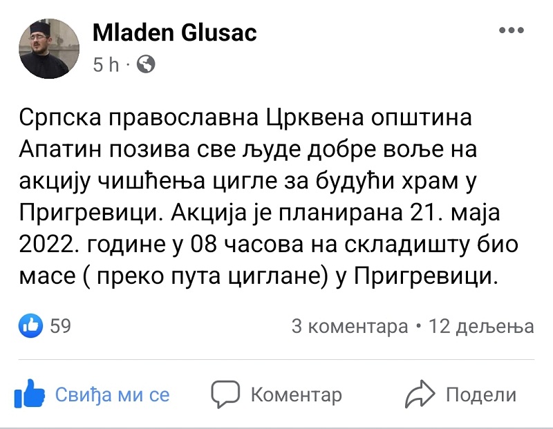 Презвитер Младен Глушац је путем друштвених мрежа позвао све људе добре воље на акцију чишћења цигле за будући храм у Пригревици. Акција се планира 21. маја 2022. године у 08 часова на складишту био масе ( преко пута циглане) у Пригревици.