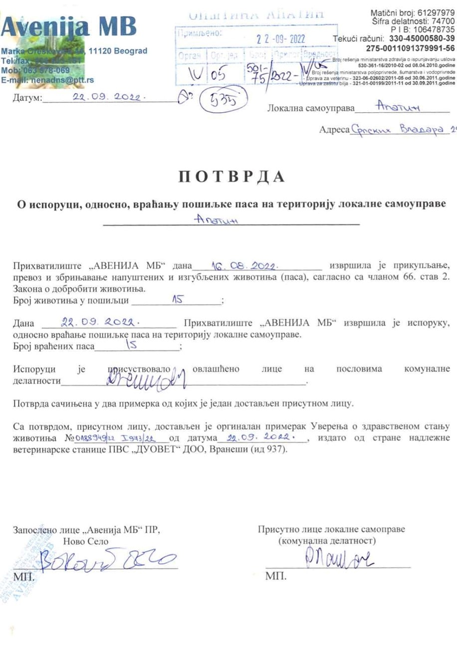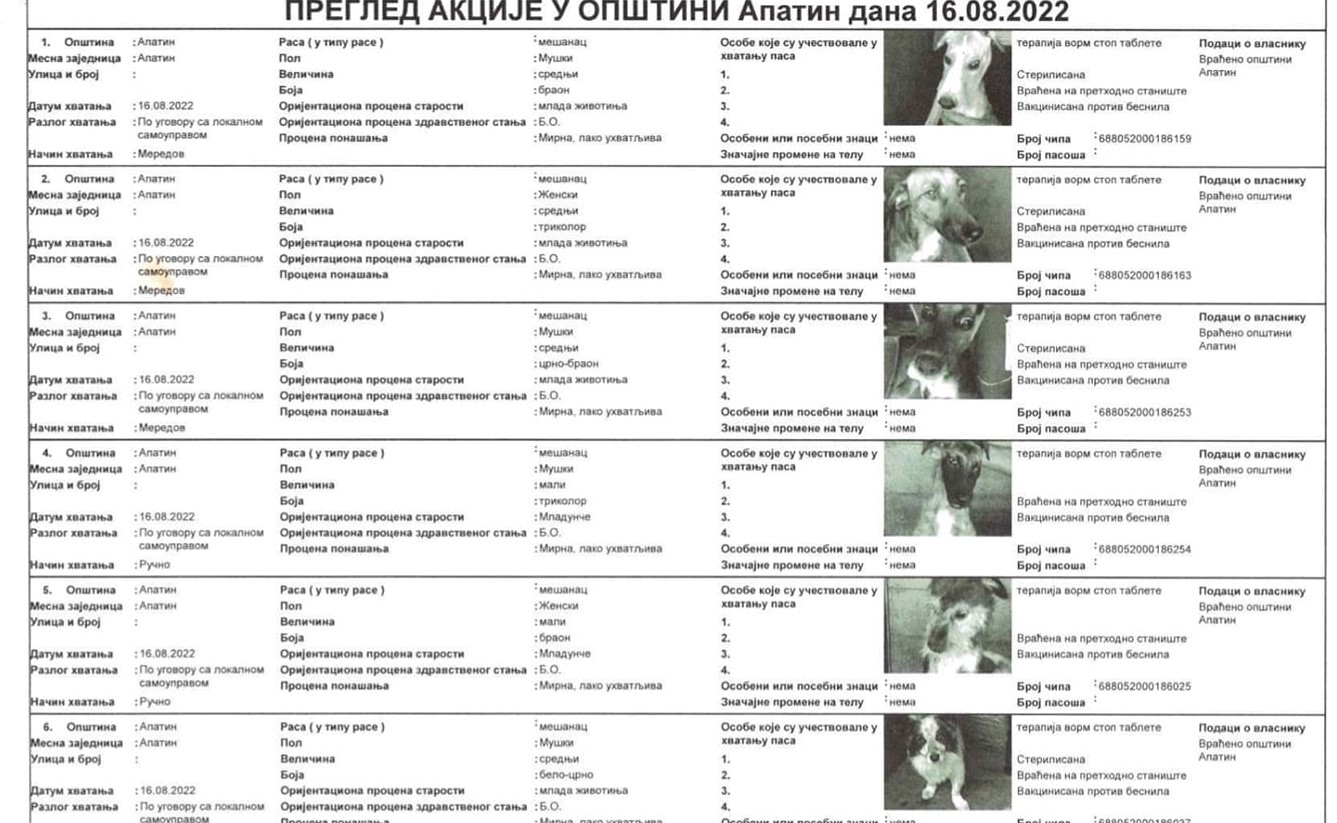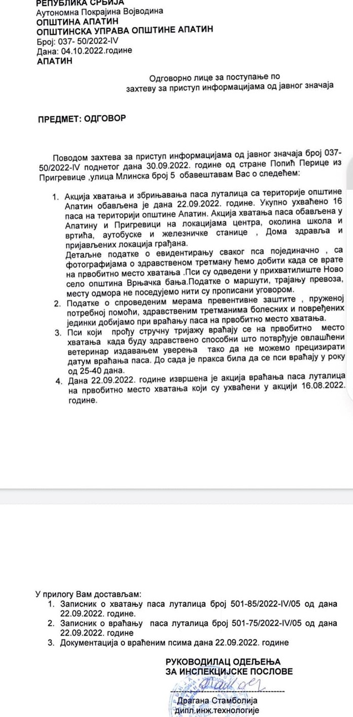 У одговору који му је достављен ових дана, наведено је да је акција хватања и збрињавања паса луталица на подручју наше општине обављена 22. септембра, да је укупно ухваћено 16 паса и то 12 у Апатину и 4 у Пригревици. Акција је, наведено је, обављена на локацијама центра, околине школа и вртића, аутобуске и железничке станице, Дома здравља и пријављених локација грађана. Пси су одведени у прихватилиште Ново Село код Врњачке Бање. Подаци о маршрути, трајању превоза и месту одмора нису наведени, јер, како је наглашено, нису ни прописани уговором.