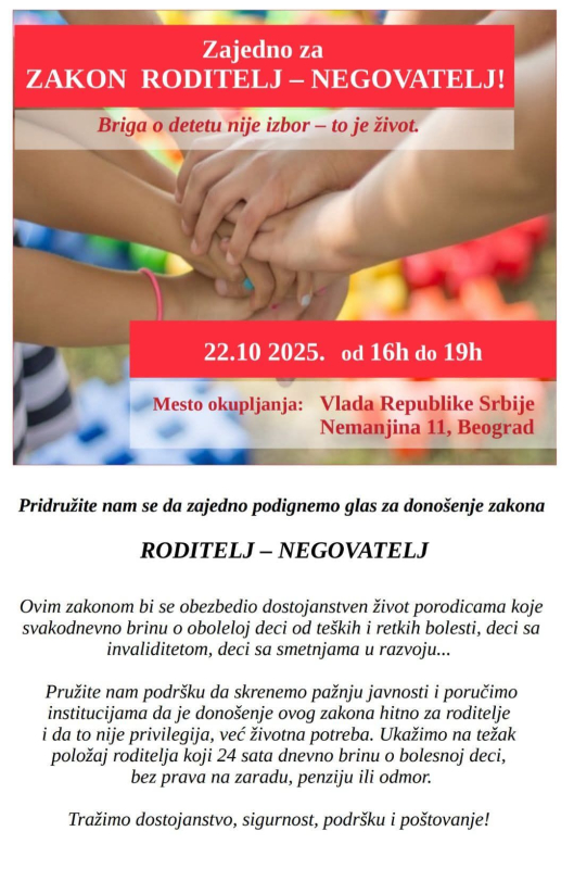 -Пружите нам подршку да скренемо пажњу јавности и поручимо институцијама да је доношење овог закона хитно за родитеље и да то није привилегија, већ животна потреба. Укажимо на тежак положај родитеља који 24 сата дневно брину о болесној деци, без права на зараду, пензију или одмор. Тражимо достојанство, сигурност, подршку и поштовање, стоји у апелу.