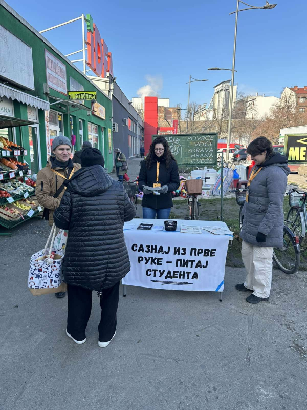 -Чињеница је да живимо у “медијском мраку” већ дужи низ година и да смо дехуманизовани и називани погрдним именима, као будући академски грађани, што је недопустиво. Зато смо се и одлучили да се приближимо грађанима и на овај начин, да разговарамо са свима, без обзира на њихове ставове, поручили су студенти у објави на друштвеним мрежама кад су започели ову акцију.