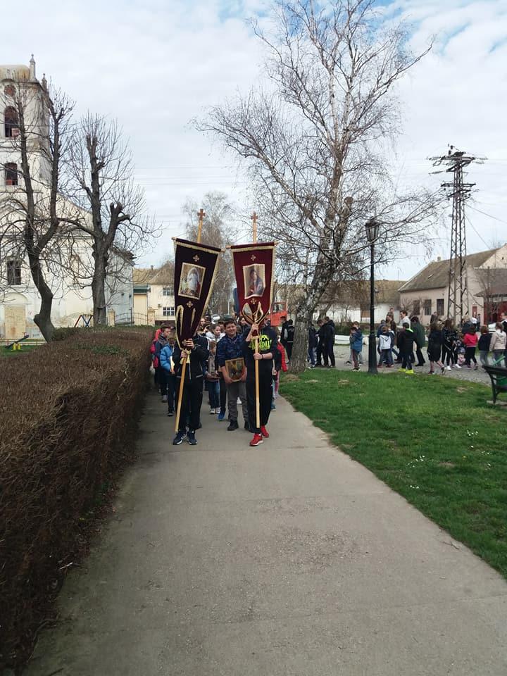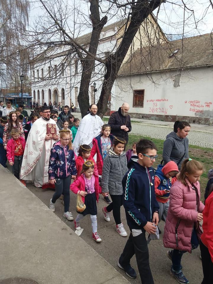 Након Литургије и причежћа, деца с у са освештаним врбовим гранама, од којих су направили венчиће учествовали у опходу око Богомоље.